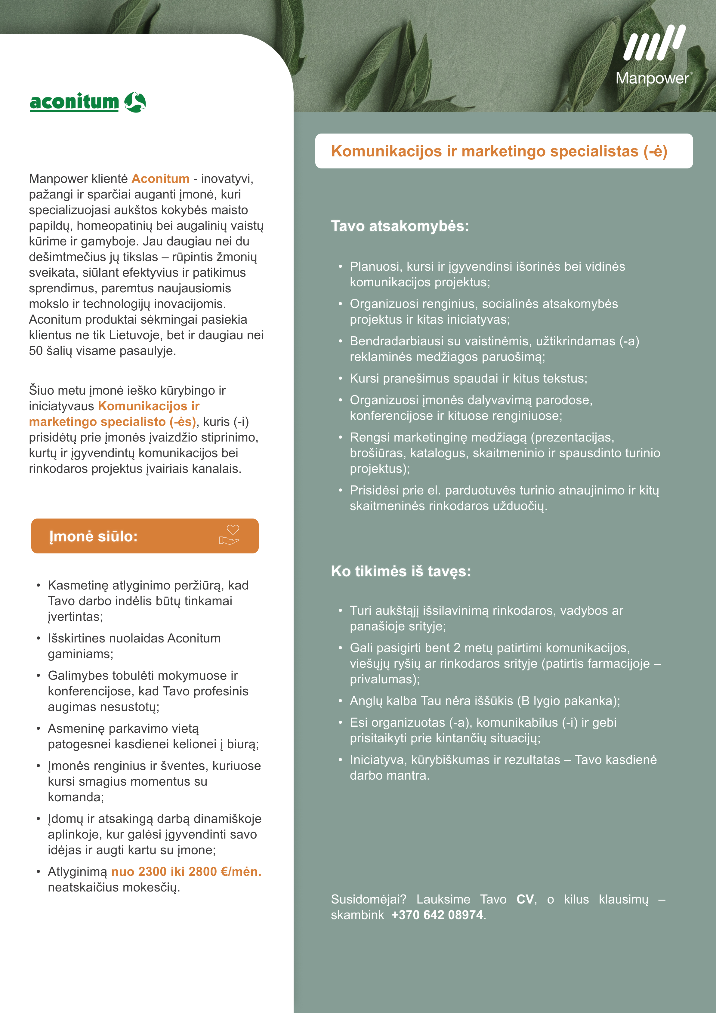 Manpower klientė Aconitum - inovatyvi, pažangi ir sparčiai auganti įmonė, kuri specializuojasi aukštos kokybės maisto papildų, homeopatinių bei augalinių vaistų kūrime ir gamyboje. Jau daugiau nei du dešimtmečius jų tikslas rūpintis žmonių sveikata, siūlant efektyvius ir patikimus sprendimus, paremtus naujausiomis mokslo ir technologijų inovacijomis. Aconitum produktai sėkmingai pasiekia klientus ne tik Lietuvoje, bet ir daugiau nei 50 šalių visame pasaulyje.