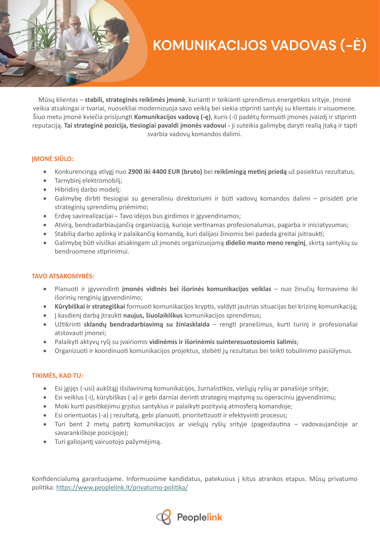 Mūsų klientas stabili, strateginės reikšmės įmonė, kurianti ir teikianti sprendimus energetikos srityje. Įmonė veikia atsakingai ir tvariai, nuosekliai modernizuoja savo veiklą bei siekia stiprinti santykį su klientais ir visuomene. Šiuo metu įmonė kviečia prisijungti Komunikacijos vadovą (-ę), kuris (-i) padėtų formuoti įmonės įvaizdį ir stiprinti reputaciją. Tai strateginė pozicija, tiesiogiai pavaldi įmonės vadovui - ji suteikia galimybę daryti realią įtaką ir tapti svarbia vadovų komandos dalimi.