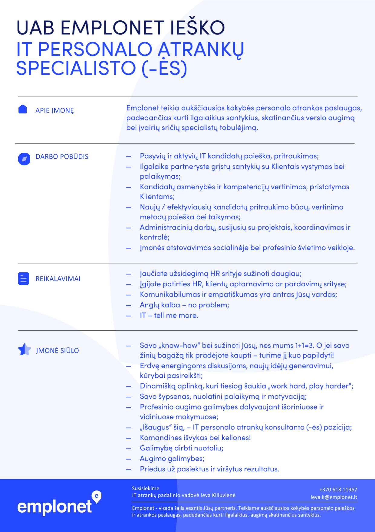Emplonet - visada šalia esantis Jūsų partneris. Mes teikiame aukščiausios kokybės personalo paieškos ir atrankos paslaugas, padedančias kurti ilgalaikius santykius, skatinančius verslo augimą bei įvairių sričių specialistų tobulėjimą.