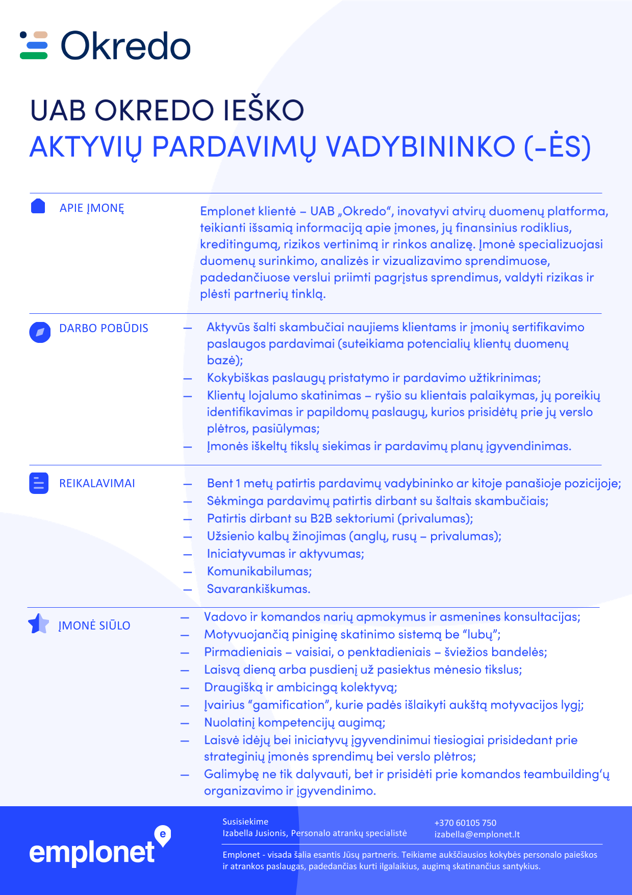 Emplonet klientė - UAB Okredo, inovatyvi atvirų duomenų platforma, teikianti išsamią informaciją apie įmones, jų finansinius rodiklius, kreditingumą, rizikos vertinimą ir rinkos analizę. Įmonė specializuojasi duomenų surinkimo, analizės ir vizualizavimo sprendimuose, padedančiuose verslui priimti pagrįstus sprendimus, valdyti rizikas ir plėsti partnerių tinklą.