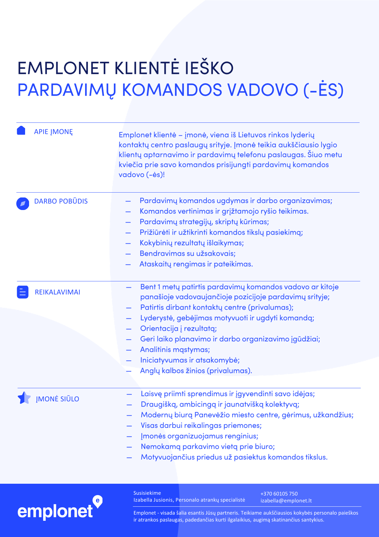 Emplonet klientė - įmonė, viena iš Lietuvos rinkos lyderių kontaktų centro paslaugų srityje. Įmonė teikia aukščiausio lygio klientų aptarnavimo ir pardavimų telefonu paslaugas. Šiuo metu kviečia prie savo komandos prisijungti pardavimų komandos vadovo (-ės)!