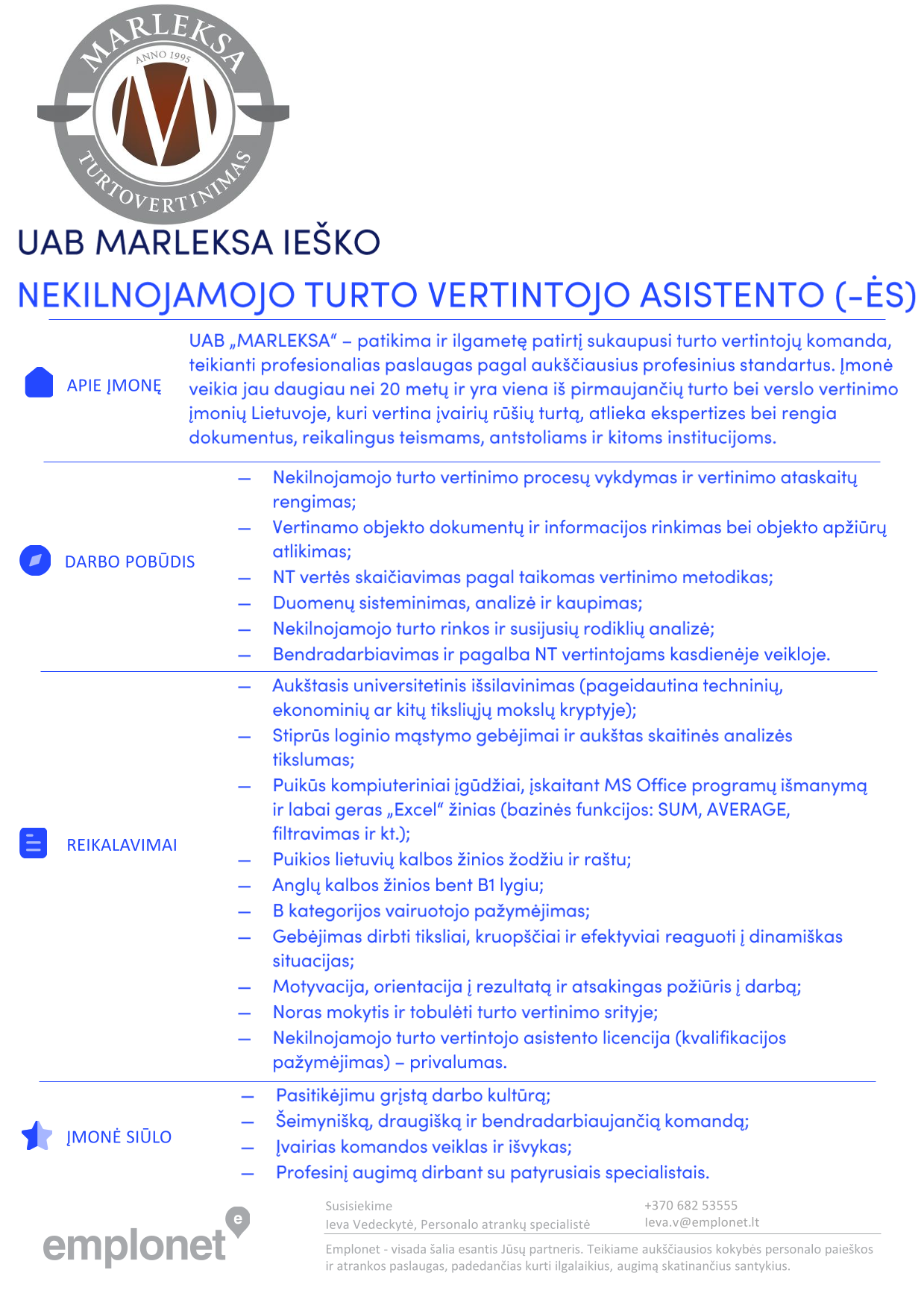 Emplonet klientė - UAB MARLEKSA - patikima ir ilgametę patirtį sukaupusi turto vertintojų komanda, teikianti profesionalias paslaugas pagal aukščiausius profesinius standartus. Įmonė veikia jau daugiau nei 20 metų ir yra viena iš pirmaujančių turto bei verslo vertinimo įmonių Lietuvoje, kuri vertina įvairių rūšių turtą, atlieka ekspertizes bei rengia dokumentus, reikalingus teismams, antstoliams ir kitoms institucijoms.