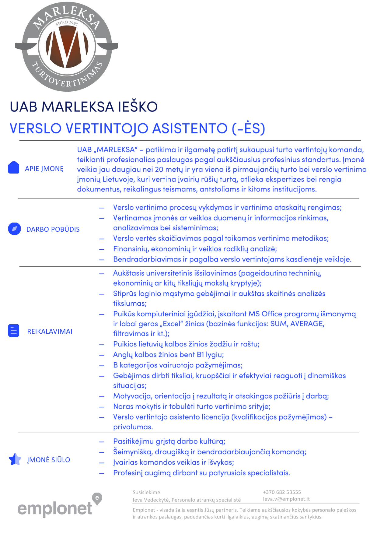 Emplonet klientė - UAB MARLEKSA - patikima ir ilgametę patirtį sukaupusi turto vertintojų komanda, teikianti profesionalias paslaugas pagal aukščiausius profesinius standartus. Įmonė veikia jau daugiau nei 20 metų ir yra viena iš pirmaujančių turto bei verslo vertinimo įmonių Lietuvoje, kuri vertina įvairių rūšių turtą, atlieka ekspertizes bei rengia dokumentus, reikalingus teismams, antstoliams ir kitoms institucijoms.