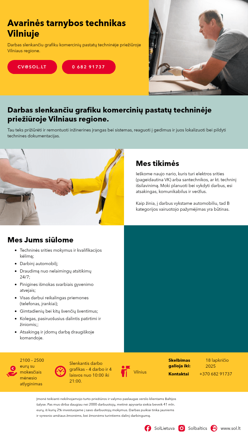 SOL yra tarptautinė nekilnojamojo turto priežiūros ir palaikymo paslaugas siūlanti įmonė, kurios pirmtakas buvo įkurtas 1848 metais Suomijoje. SOL yra šeimos įmonė, kurios vertybės ir principai atsispindi kasdieninėje įmonės veikloje. Savo paslaugas mes teikiame Baltijos šalyse, Suomijoje, Švedijoje ir Danijoje.