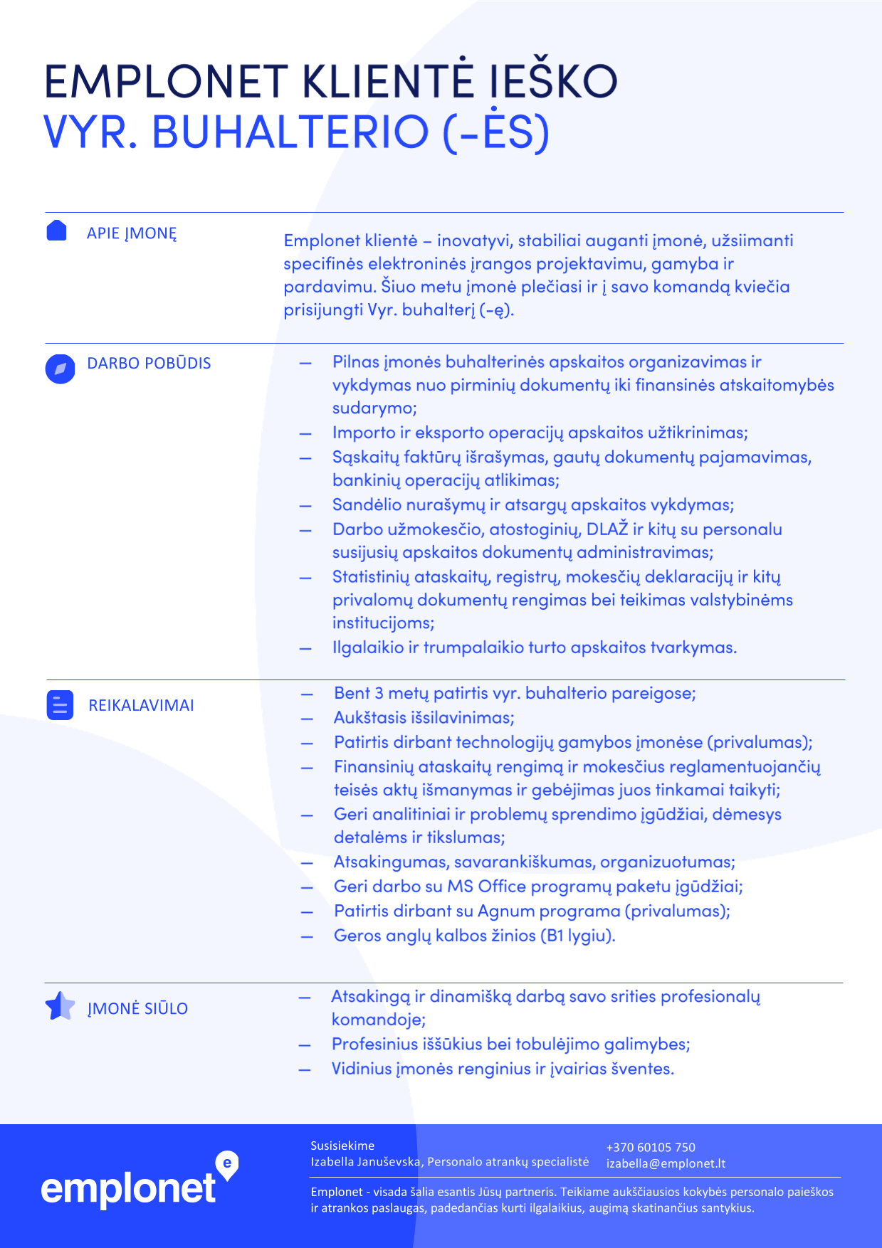 Emplonet klientė - inovatyvi, stabiliai auganti įmonė, užsiimanti specifinės elektroninės įrangos projektavimu, gamyba ir pardavimu. Šiuo metu įmonė plečiasi ir į savo komandą kviečia prisijungti Vyr. buhalterį (-ę).