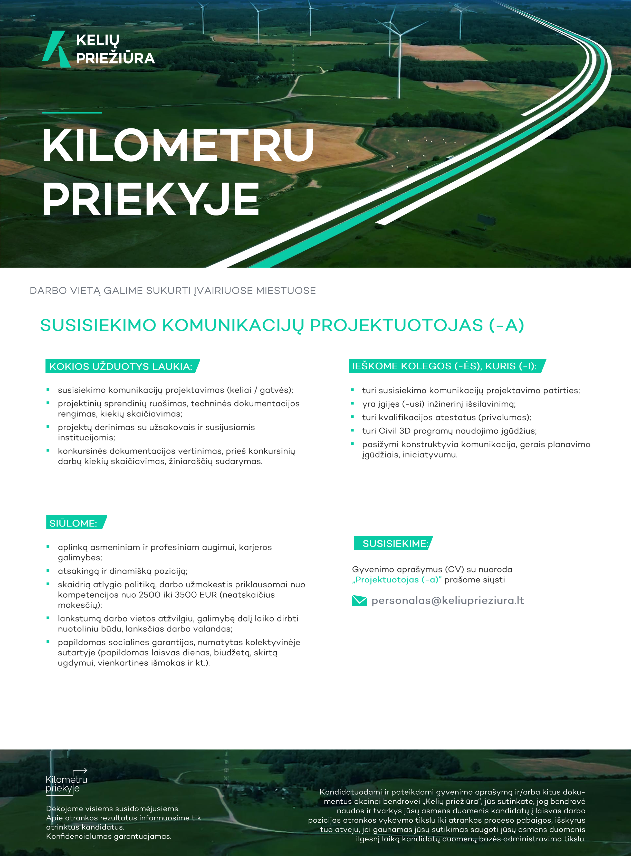 AB Kelių priežiūra yra moderni, ambicingų tikslų siekianti, ilgalaikę patirtį sukaupusi įmonė, kurioje dirba per 2.300 darbuotojų. Bendrovė atsakinga už 21.000 km valstybinės reikšmės kelių priežiūrą, t.y. žiemą užtikrina, kad keliai būtų pravažiuojami, pavasarįrudenį gerina kelių kokybę, atnaujindama susidėvėjusias kelių dangas, profiliuodama žvyrkelius, prižiūrėdama pakelės statinius, želdinius ir kt. Bendrovė taip pat atlieka kelio remonto, statybos, ženklinimo darbus, teikia sunkiasvorės technikos remonto servisą, gamina asfalto produkciją bei kt. AB Kelių priežiūra komanda, siekianti būti kilometru priekyje.