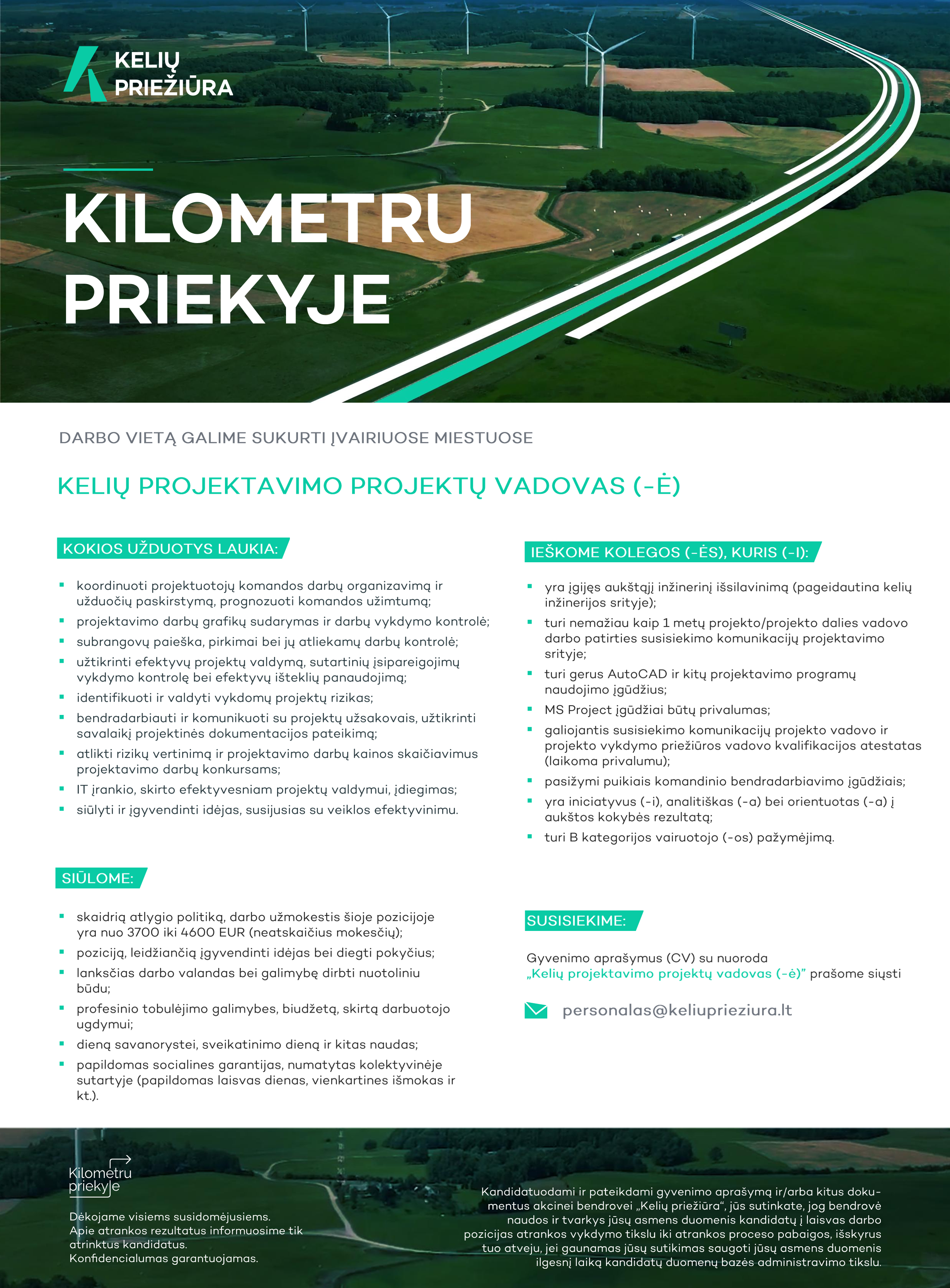 Kandidatuodami ir pateikdami gyvenimo aprašymą ir/arba kitus dokumentus akcinei bendrovei Kelių priežiūra, jūs sutinkate, jog bendrovė naudos ir tvarkys jūsų asmens duomenis kandidatų į laisvas darbo pozicijas atrankos vykdymo tikslu iki atrankos proceso pabaigos, išskyrus tuo atveju, jei gaunamas jūsų sutikimas saugoti jūsų asmens duomenis ilgesnį laiką kandidatų duomenų bazės administravimo tikslu.
