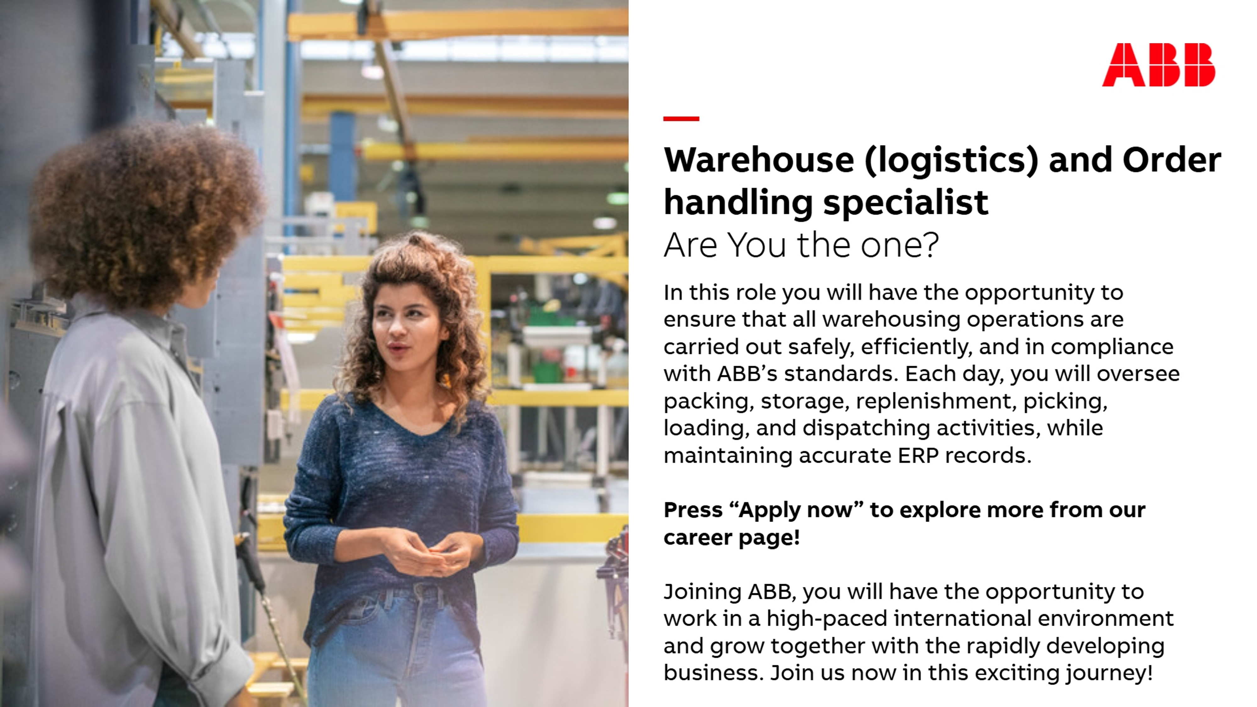 Šioje pozicijoje būsite atsakingas(-a) už saugiai ir efektyviai vykdomus visus sandėliavimo procesus laikantis ABB standartų. Kasdien prižiūrėsite pakavimo, saugojimo, papildymo, užsakymų surinkimo, pakrovimo ir išsiuntimo procesus, užtikrinant tikslius duomenis ERP sistemoje. Taip pat palaikysite glaudų bendradarbiavimą su tiekėjais ir suinteresuotosiomis šalimis, užtikrinant aukštus kokybės standartus ir laikantis ABB elgesio kodekso.