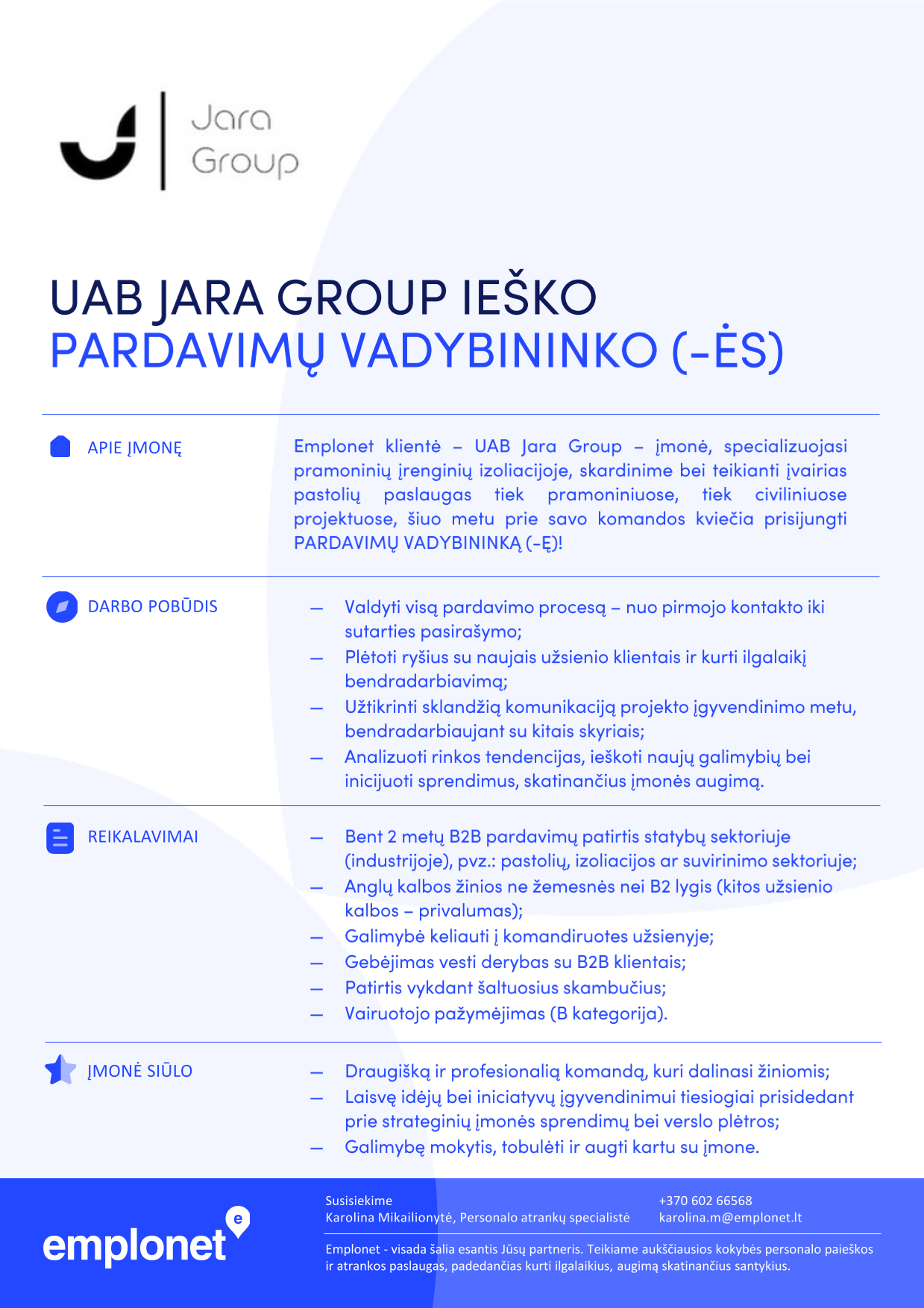 Emplonet klientė - UAB Jara Group - įmonė, specializuojasi pramoninių įrenginių izoliacijoje, skardinime bei teikianti įvairias pastolių paslaugas tiek pramoniniuose, tiek civiliniuose projektuose, šiuo metu prie savo komandos kviečia prisijungti PARDAVIMŲ VADYBININKĄ (-Ę)!
