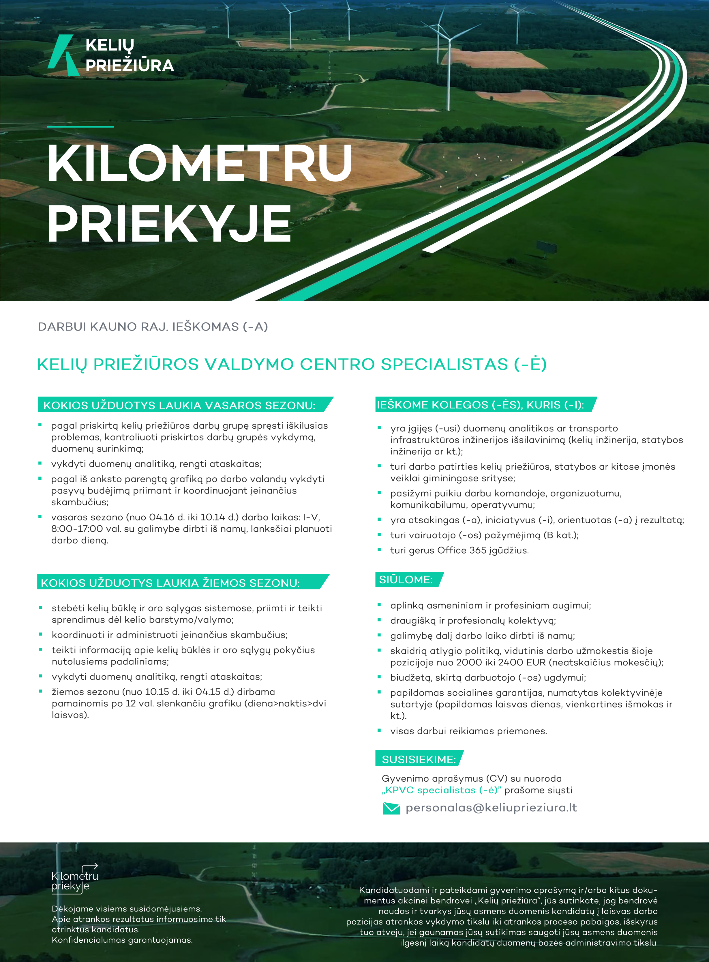 Kandidatuodami ir pateikdami gyvenimo aprašymą ir/arba kitus dokumentus akcinei bendrovei Kelių priežiūra, jūs sutinkate, jog bendrovė naudos ir tvarkys jūsų asmens duomenis kandidatų į laisvas darbo pozicijas atrankos vykdymo tikslu iki atrankos proceso pabaigos, išskyrus tuo atveju, jei gaunamas jūsų sutikimas saugoti jūsų asmens duomenis ilgesnį laiką kandidatų duomenų bazės administravimo tikslu.
