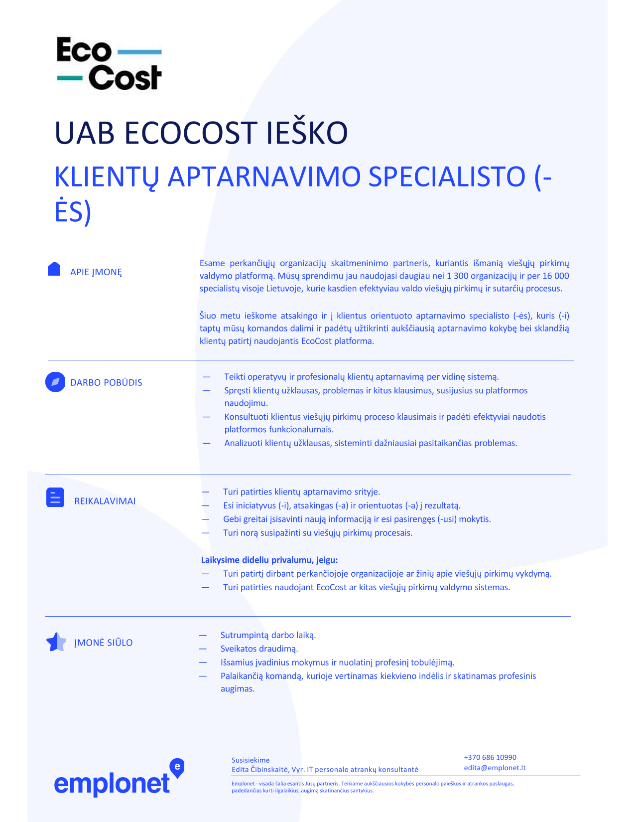Emplonet klientė - EcoCost. Pagrindinė įmonės kryptis - viešųjų pirkimų valdymui skirtų sistemų vystymas. Įmonės sukurta platforma yra plačiausiai naudojama tokio tipo sistema Lietuvoje, kurią naudoja didžiausios įmonės ir organizacijos viešajame sektoriuje.