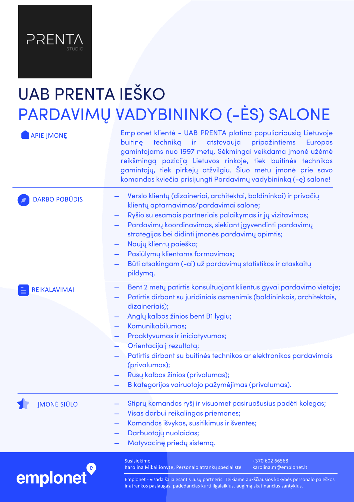 Emplonet klientė - UAB PRENTA platina populiariausią Lietuvoje buitinę techniką ir atstovauja pripažintiems Europos gamintojams nuo 1997 metų. Sėkmingai veikdama įmonė užėmė reikšmingą poziciją Lietuvos rinkoje, tiek buitinės technikos gamintojų, tiek pirkėjų atžvilgiu. Šiuo metu įmonė prie savo komandos kviečia prisijungti Pardavimų vadybininką (-ę) salone!