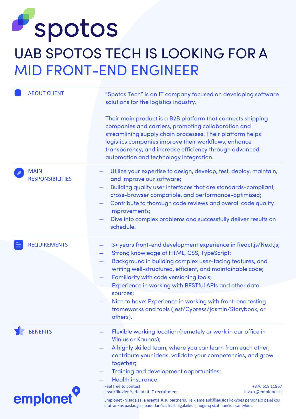 Emplonet client - Spotos Tech is an IT company focused on developing software solutions for the logistics industry. Their main product is a B2B platform that connects shipping companies and carriers, promoting collaboration and streamlining supply chain processes.