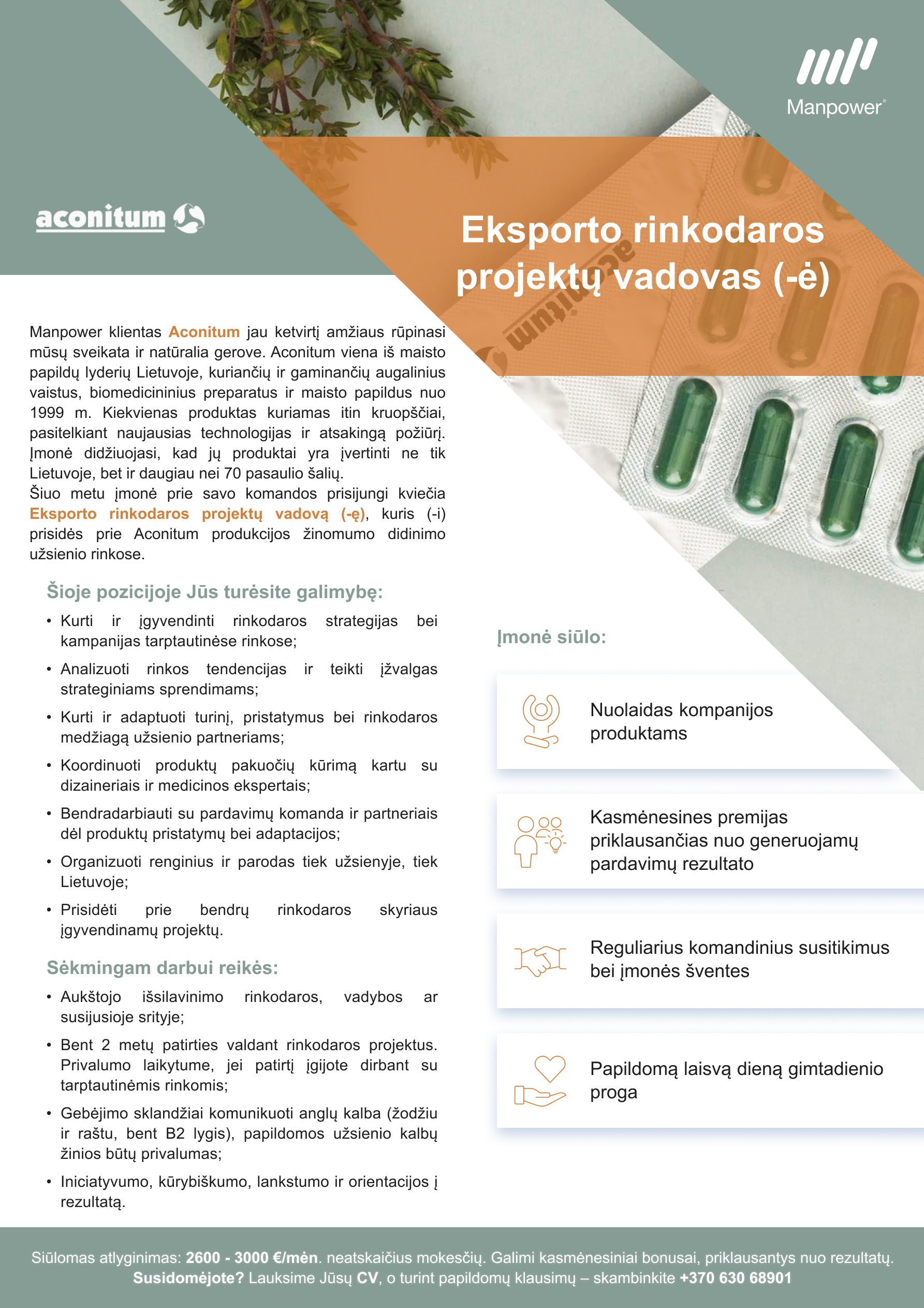 Šiuo metu įmonė prie savo komandos prisijungi kviečia Eksporto rinkodaros projektų vadovą (-ę), kuris (-i) prisidės prie Aconitum produkcijos žinomumo didinimo užsienio rinkose.